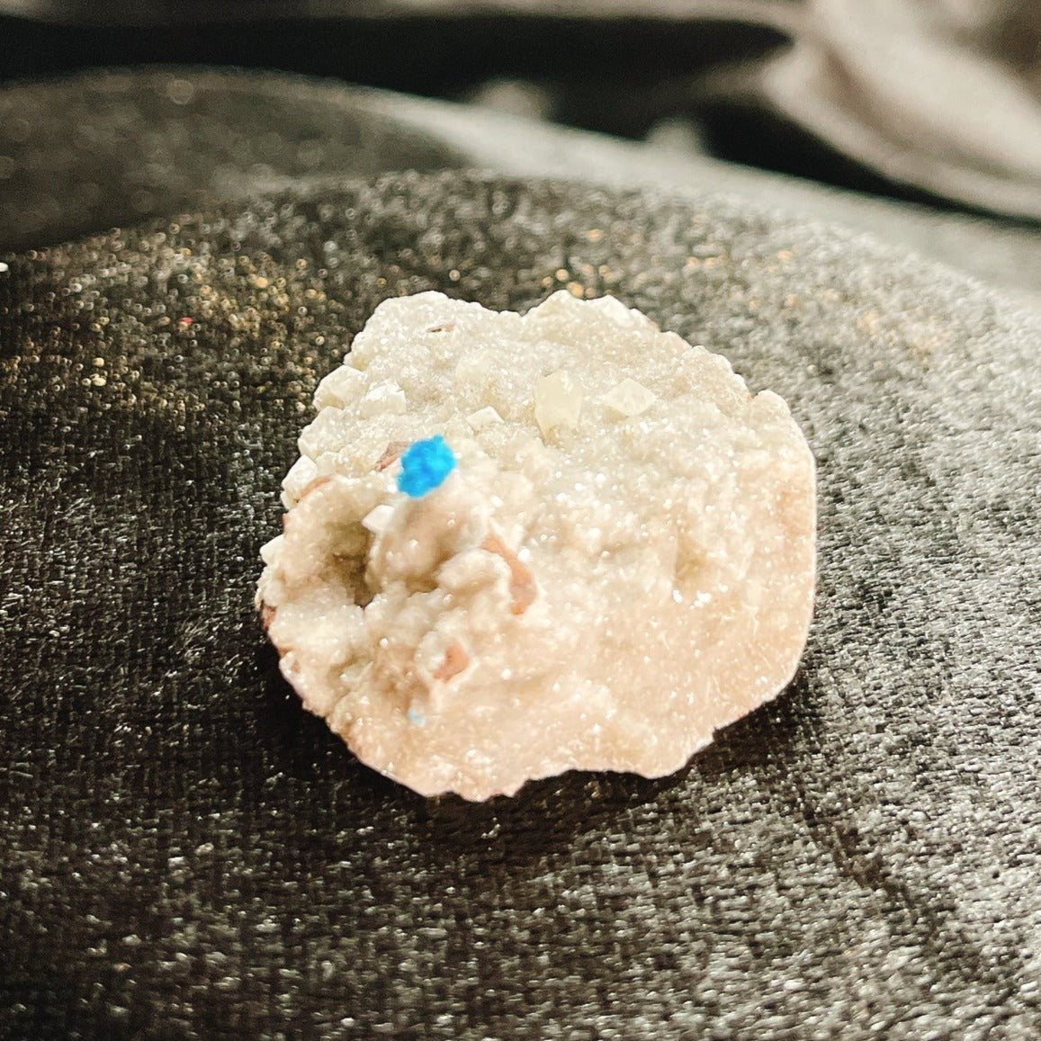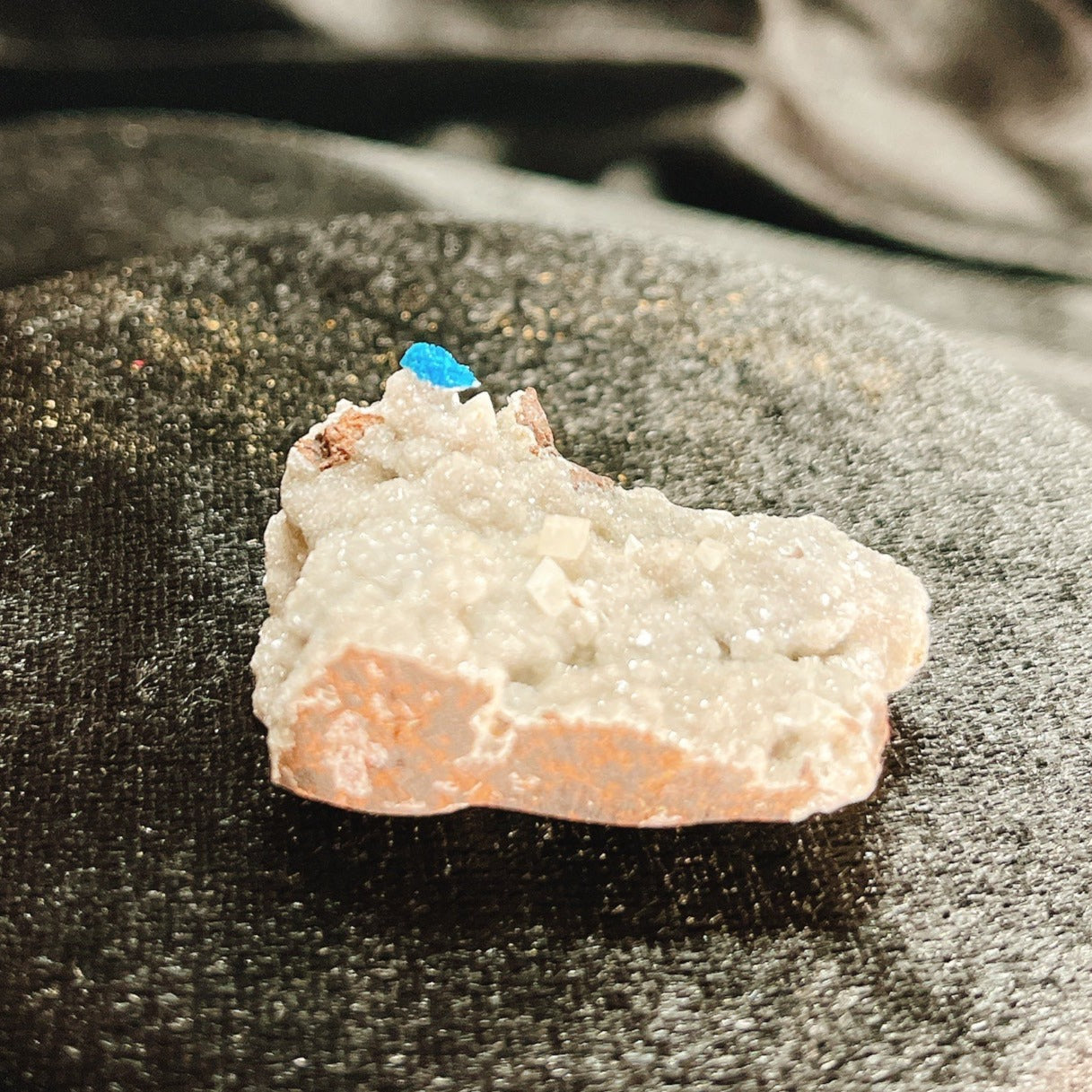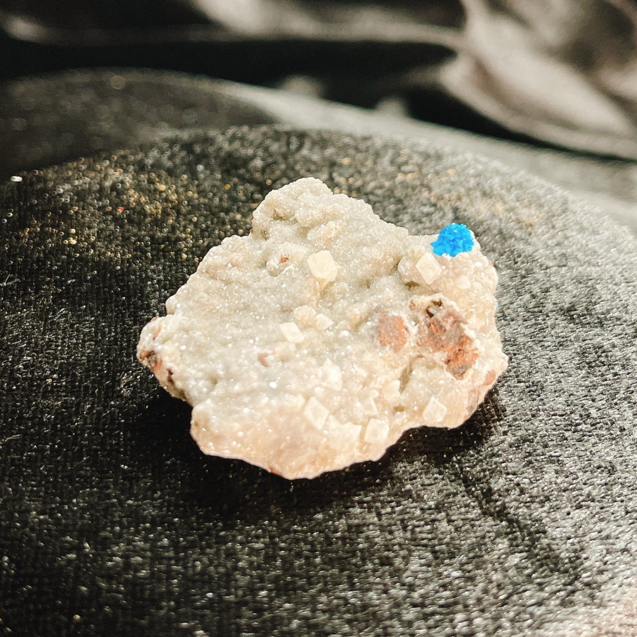 特徴は針状の結晶が放射状に伸びることにより形成される金平糖のような丸くモコモコとした結晶、そしてこの鮮やかなコバルトブルーです。