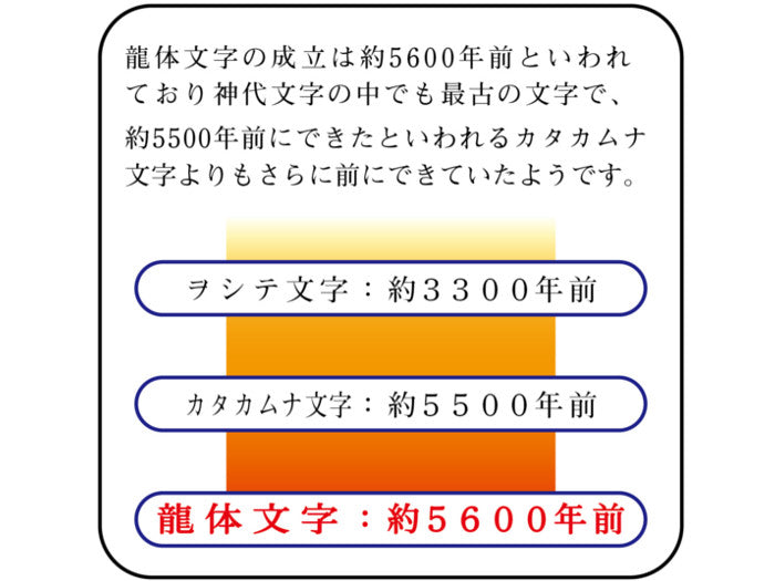 龍体文字の成立は約5600年前といわれており神代文字の中でも最古の文字で、