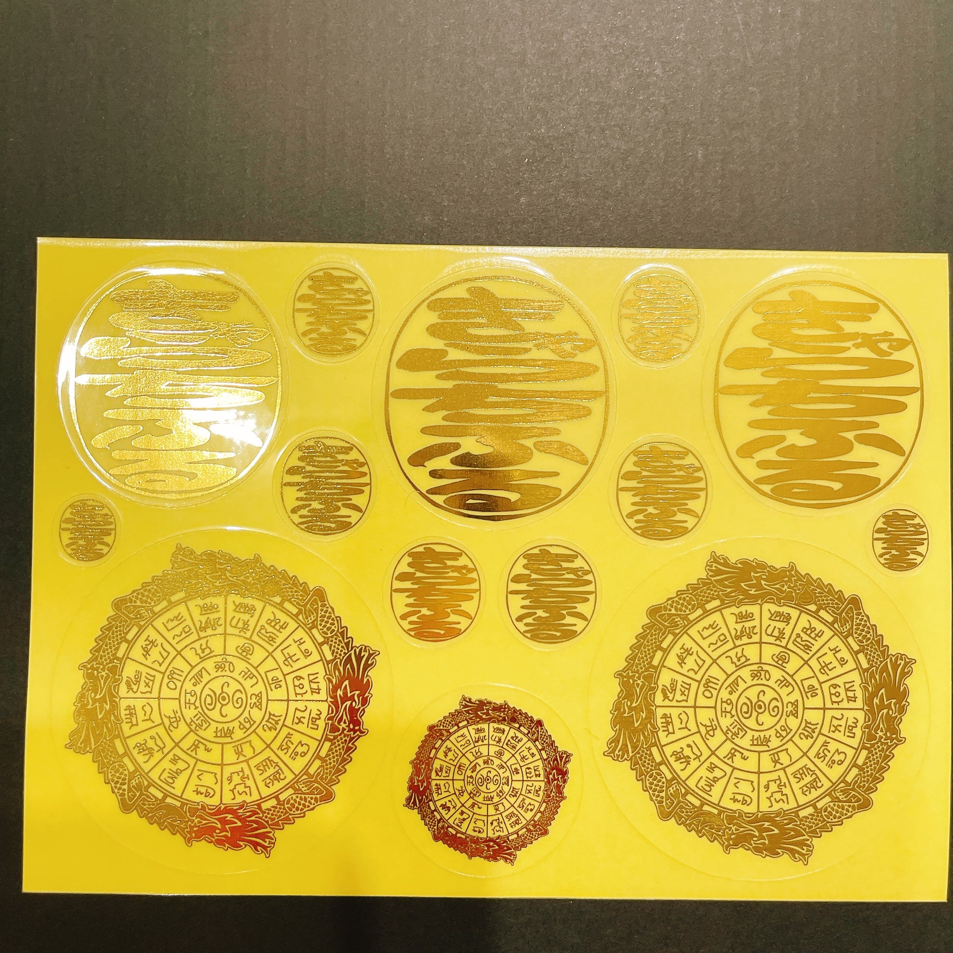 ゴールド箔の龍体文字のフトマニ図(直径5.5cmx2、直径3.0cmx1)ときゃらちふるのロゴがちりばめられた透明ステッカーです。スマホの裏面やクリアファイルの表面などお好きなところに貼ってお楽しみください。