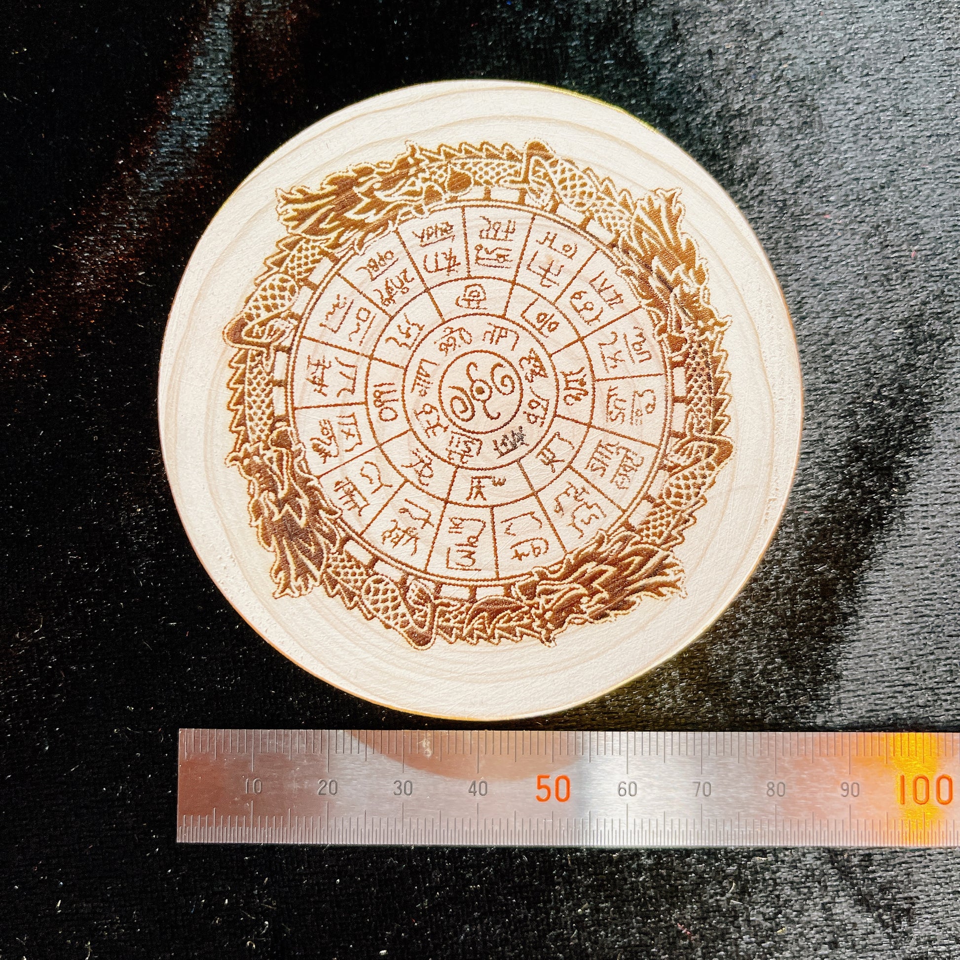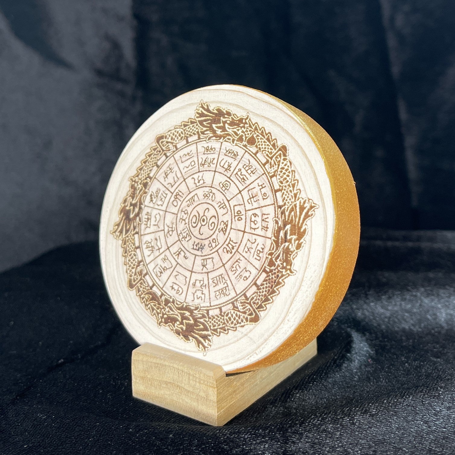 四龍神を周囲に配した龍体文字のフトマニ図です。裏面には「絶対点」を配し、かつ周囲はゴールド色でペイントされております。
